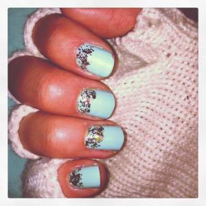 You probably see all the different ways on pinterest to do your nails, but my friend introduced me to this look. I’m one of the most impatient self manicurists out there (note the uneven glitter) and I still love it. Put on two coats of the solid paint of your choice on the bottom, then two half coats of a glitter color (I suggest OPI Muppet Babies Rainbow Connection or OPI Nicki Minaj Save Me) let it dry then add the top coat!