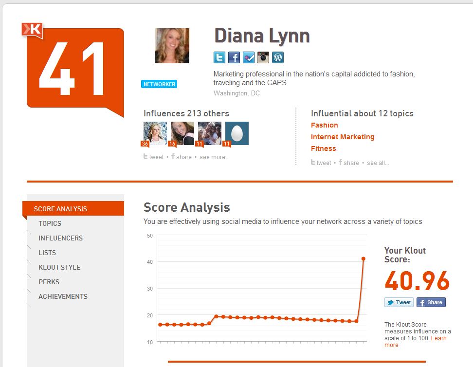 Klout helps measure how influential you are in the social sphere – how many people you influence and how much you influence them. Also, you can determine where (what channel) and on what topic (fashion, marketing, etc) you are most influential. I just started blogging, so of course, I have very few readers (thanks by the way 🙂 ), but have been an avid Facebook user for over 8+ years now. Naturally, I’m most influential on the FB, and some on Twitter. I don’t think Klout yet measures your PInterest and Instagram influence, but I hope it does soon. Klout has also taken advantage of giving perks for social sharing, something newly popular and also seen with the TV check-in app Viggle. The more influence you have over your network, the more perks that are unlocked for you including first access to new social applications, gift cards, and even ipods and e-readers!